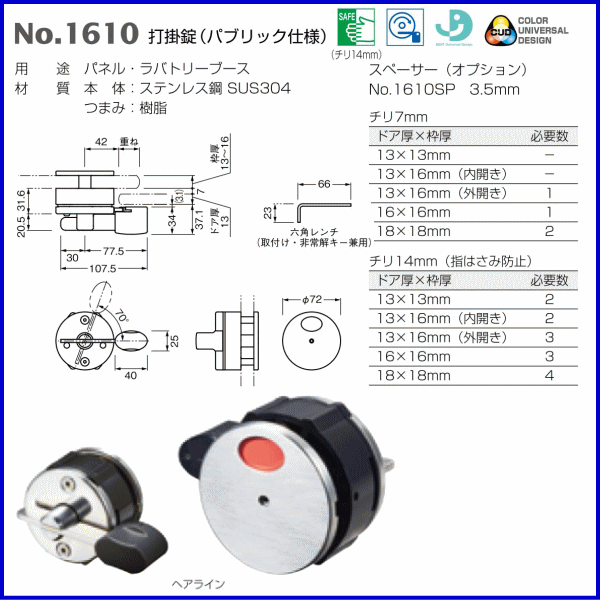 ベスト 打掛錠(指はさみ防止) No.610BD-C13-13 パネル厚13mm用 /1組 (ラバトリー カギ 錠 鍵 ロック トイレ ドア 交換 株式会社ベスト BEST 金物)